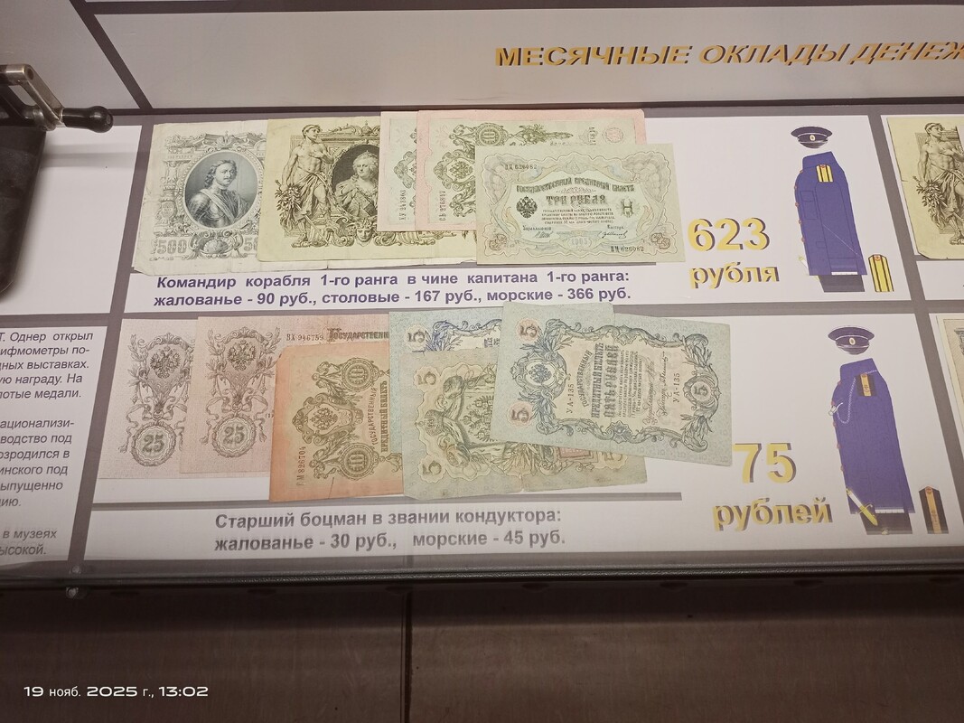 Экспозиция предлагает посетителям уникальный взгляд на материальную сторону службы военных моряков и детально раскрывает сложную структуру денежного содержания офицеров и чинов флота.