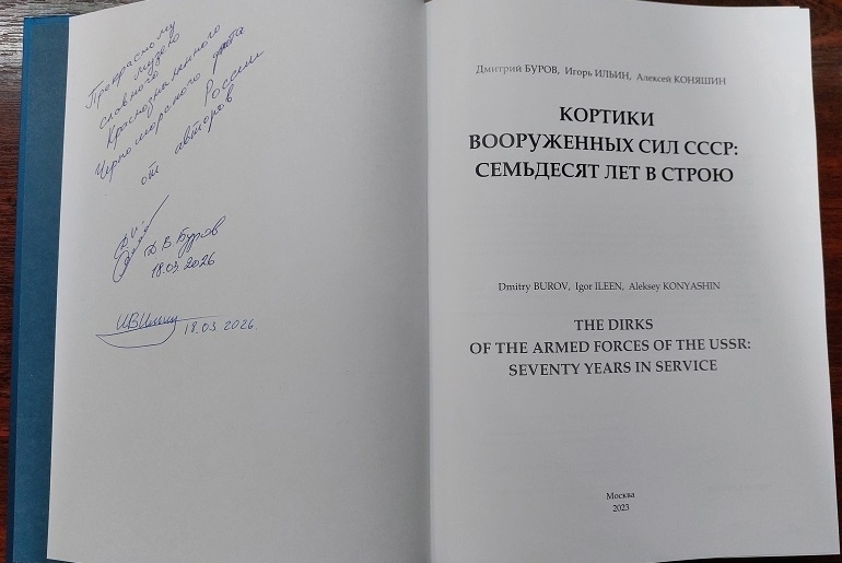 В библиотеку филиала ФГБУ "ЦВММ" "Музей Черноморского флота" в г. Севастополь 18 марта поступило уникальное издание "Кортики вооружённых сил СССР: семьдесят лет в строю". - М.: 2023. Авторы книги Дмитрий Буров, Игорь Ильин и Алексей Коняшин оставили на книге свои дарственные надписи.