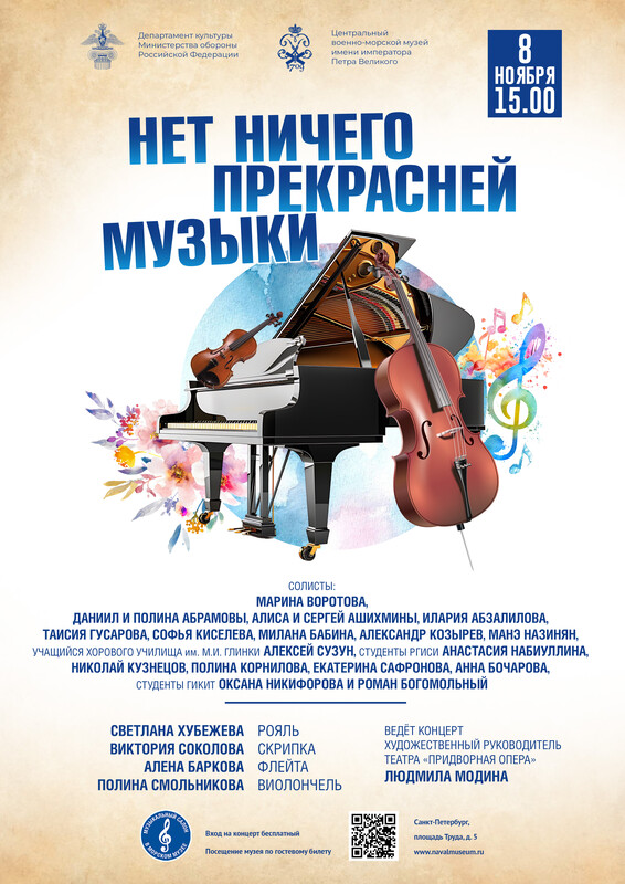 8 ноября в 15 часов в Музыкальном салоне Морского музея пройдет концерт «Нет ничего прекрасней музыки».