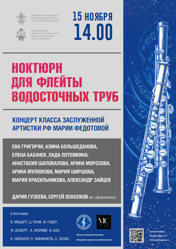 15 ноября в 14 часов в Музыкальном салоне Морского музея пройдет концерт класса заслуженной артистки России Марии Федотовой «Ноктюрн для флейты водосточных труб».