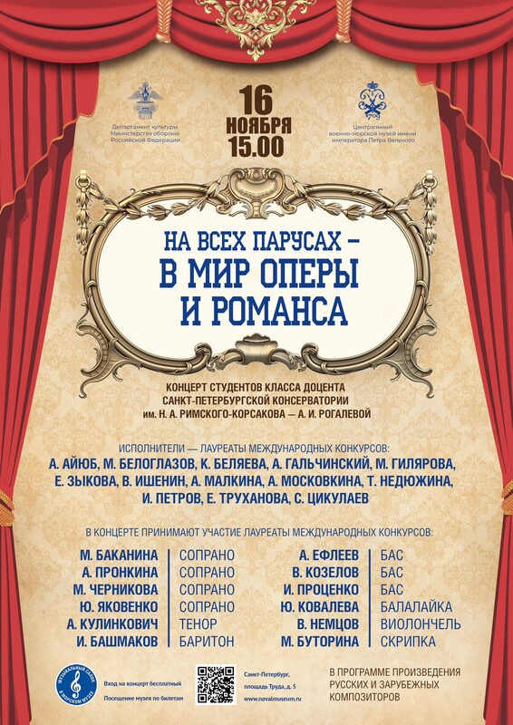 16 ноября в 15 часов приглашаем вас на концерт студентов класса доцента Санкт-Петербургской консерватории им. Н.А. Римского-Корсакова – А.И. Рогалевой «На всех парусах – в мир оперы и романса».