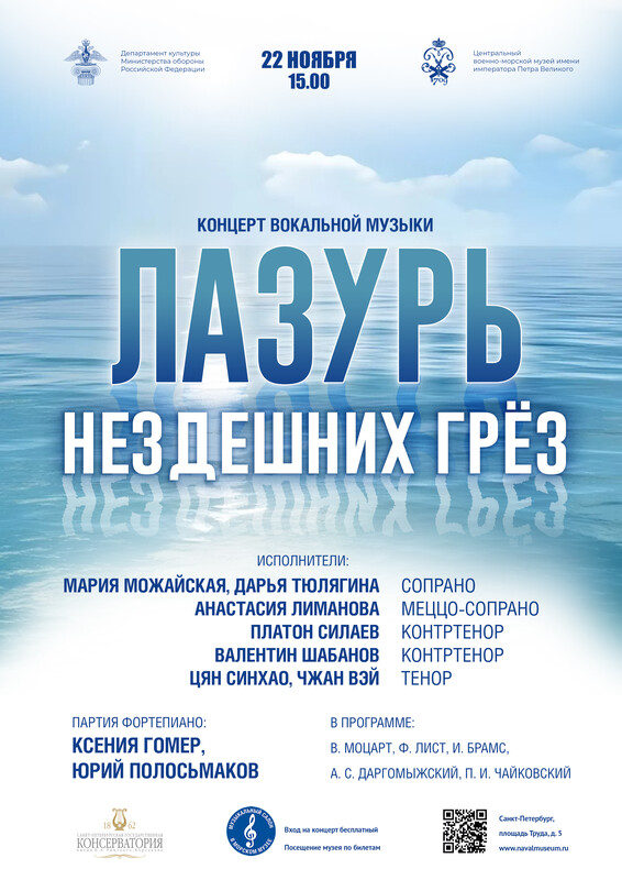 22 ноября в 15 часов в Музыкальном салоне Морского музея пройдет концерт вокальной музыки «Лазурь нездешних грёз»