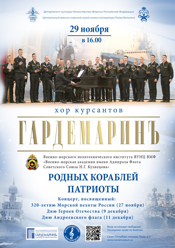 29 ноября в 16 часов в Музыкальном салоне Морского музея пройдет концерт «Родных кораблей патриоты». Хор курсантов Военно-морского политехнического института ВУНЦ ВМФ «Военно-морская академия имени Адмирала Флота Советского Союза Н.Г. Кузнецова» посвятит свое выступление 320-летию Морской пехоты (27 ноября), Дню Героев Отечества (9 декабря) и Дню Андреевского флага (11 декабря).