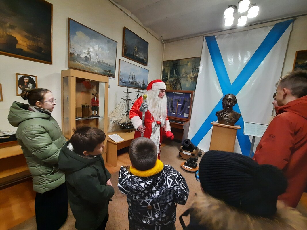 Продолжением праздника стало увлекательное тематическое путешествие по экспозиции Музея Балтийского флота, которое для детей провёл сам Дед Мороз. Это необычная экскурсия позволила ребятам в игровой форме прикоснуться к славной истории флота.