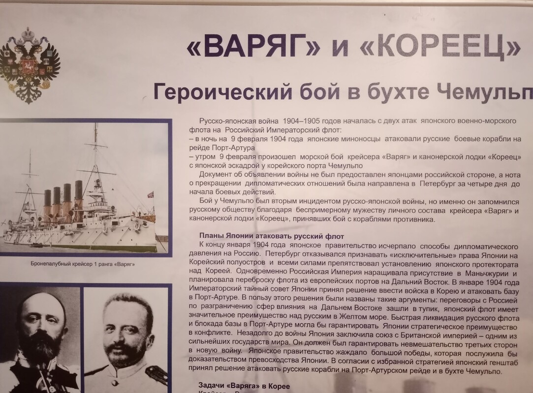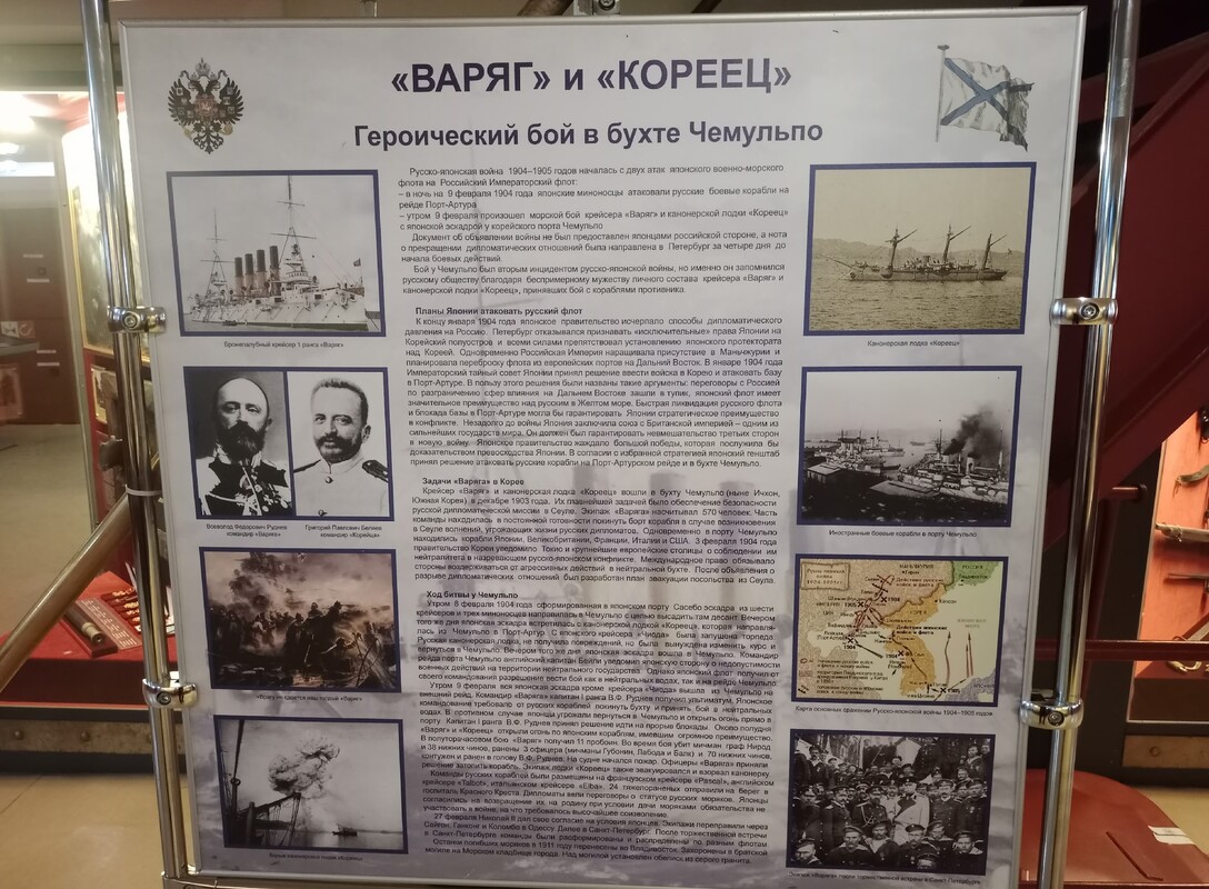 Экспозиция, уже получившая высокую оценку и интерес у всех категорий посетителей, переносит нас в январь 1904 года. Поздней ночью 27 января (9 февраля по новому стилю) без объявления войны японская эскадра атаковала русские корабли в Порт-Артуре. А уже утром того же дня в далеком корейском порту Чемульпо четырнадцать кораблей Императорского флота Японии блокировали и вынудили принять неравный бой крейсер «Варяг» и канонерскую лодку «Кореец».