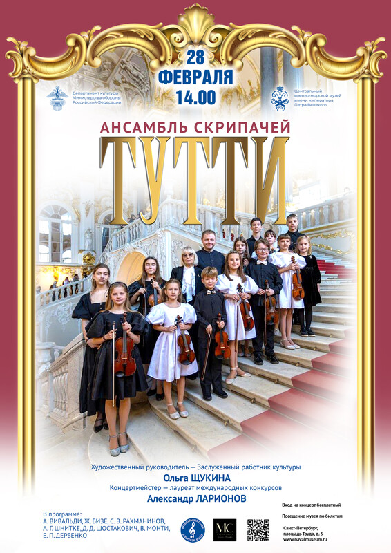 1 марта в 15 часов в стенах Центрального военно-морского музея начнется концерт класса Александры Коробкиной. Прозвучат произведения Паганини, Вьетана, Мендельсона, Брамса, Венявского, Чайковского, Рахманинова, Прокофьева и Элгара.