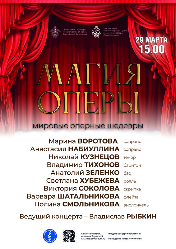 29 марта в 15 часов в рамках проекта "Музыкальный салон в Морском музее" приглашаем вас на концерт «Магия оперы», в котром прозвучат мировые оперные шедевры. Ведущий концерта Владислав Рыбкин.