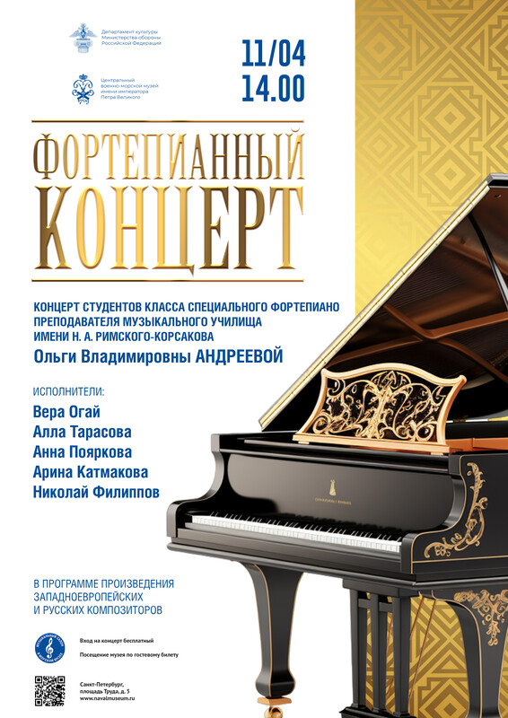 11 апреля в 14 часов в рамках проекта "Музыкальный салон в Морском музее" приглашаем вас на концерт студентов класса специального фортепиано преподавателя музыкального училища имени Н.А. Римского-Корсакова Ольги Андреевой.