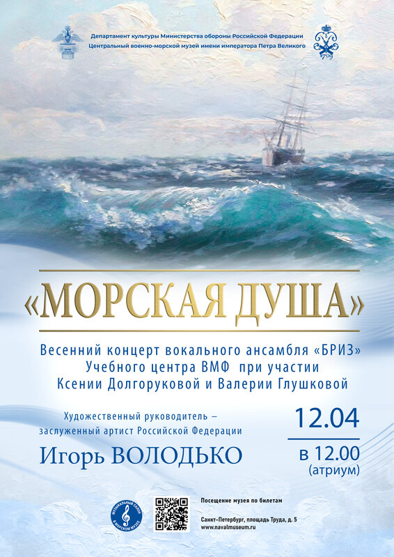 12 апреля в 12 часов в атриуме Центрального военно-морского музея начнется весенний концерт вокального ансамбля «Бриз» Учебного центра ВМФ при участии Ксении Долгоруковой и Валерии Глушковой.