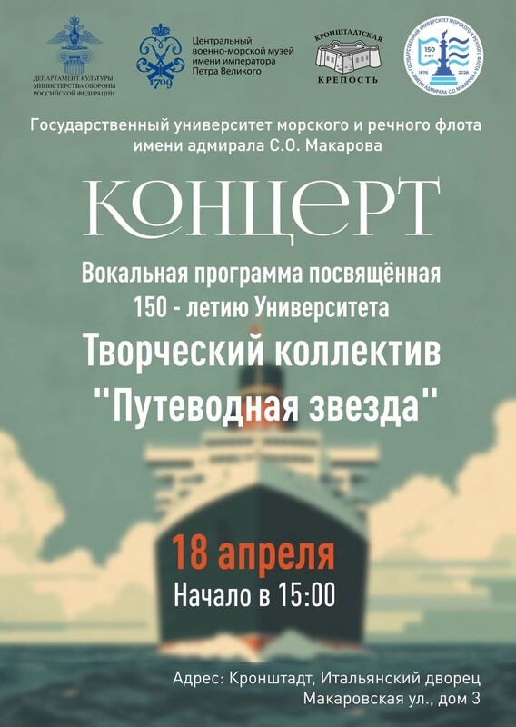 18 апреля в 15 часов в Итальянском дворце филиала ЦВММ «Кронштадтская крепость» начнется концерт творческого коллектива "Путеводная звезда", приуроченный к 150-летию Государственного университета морского и речного транспорта имени адмирала С.О. Макарова!