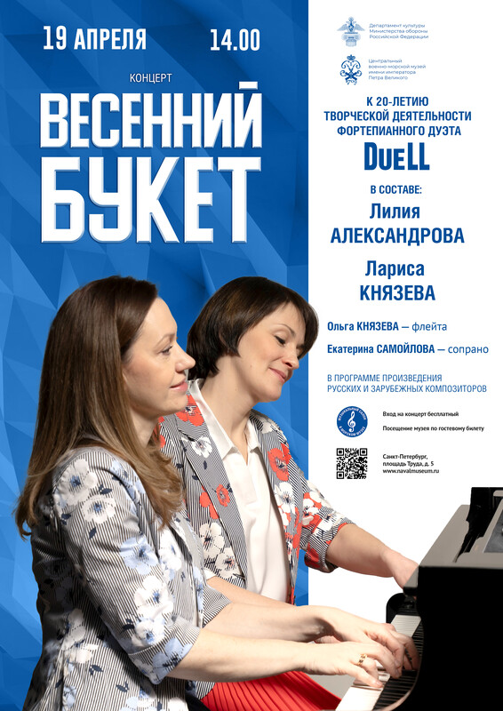 19 апреля в 14 часов в стенах Центрального военно-морского музея начнется концерт «Весенний букет» к 20-летию творческой деятельности фортепианного дуэта DueLL в составе Лидии Александровой и Ларисы Князевой.