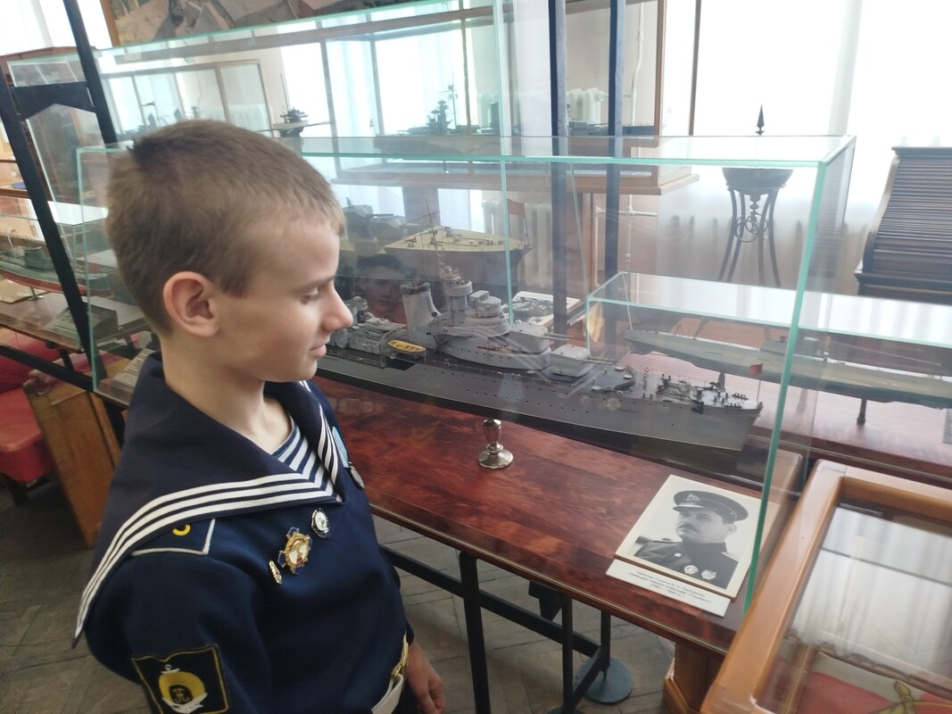 В завершение встречи было сделано памятное фото: Егор Владимирович Ерошенко, нахимовец 6 А класса, на фоне моделии в музее. лидера «Ташкент» и портрета своего прославленного прадеда — контр-адмирала Василия Николаевича Ерошенко.